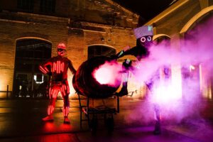 Mit eigens entwickelten Effekten und leuchtenden LED-Kostümen bringen sie galaktischen Glanz direkt zu den Menschen. Die Figuren Screenie, Robot und Clown bewegen sich durch die Menge und lassen mit ihrer Show magische Begegnungen auf Augenhöhe entstehen.