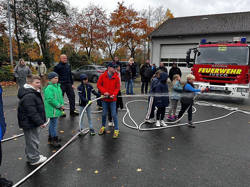 Die Kinder dürfen bei der Feuerwehr selbst an den Schlauch – ein echtes Highlight.