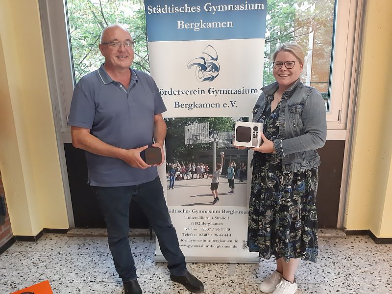 Heiko Rahn vom Förderverein des SGB und die kommissarische Schulleiterin, Maria von dem Berge mit Apple-TV-Geräten.