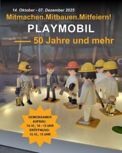 Playmobil wurde 50 Jahre alt und das möchte das Stadtmuseum Bergkamen zusammen mit den kleinen und großen Fans der beliebten Figuren und einer besonderen Ausstellung am 15. Oktober um 15 Uhr feiern! Nach der Eröffnung dürfen die kleinen Ausstellungsmacherinnen und –macher durch ihre eigene Ausstellung alle interessierten Besucher herumführen.