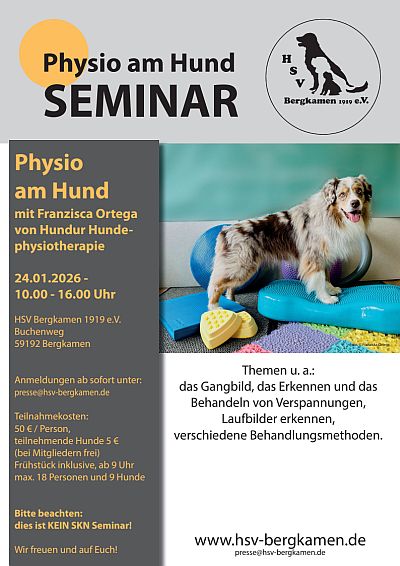 Der HSV Bergkamen e.V. lädt am 24. Januar zu einem Tagesseminar mit der Franzisca Ortega ein. Teilnehmerkosten 50 € (teilnehmende Hunde 5 €, Frühstück inklusive). Anmeldungen unter presse@hsv-bergkamen.de.