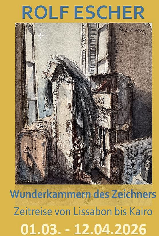 Im Mittelpunkt steht der Künstler als Reisender. In rund 80 Arbeiten aus den vergangenen zwei Jahrzehnten wird sichtbar, wie Eschers Werke unterwegs entstehen, als unmittelbare Reaktion auf Architektur, Stadträume und kulturelle Atmosphäre. Die Skizzenbücher und Zeichnungen geben Einblick in den schöpferischen Prozess und dokumentieren das Sehen als künstlerischen Akt. Als Erweiterung dieses Horizonts tritt nun Ägypten mit den Städten Kairo, Luxor und Assuan hinzu. Ein Land voller „Wunderkammern“. Die Ausstellung lädt ein, zu einer künstlerischen Zeitreise zwischen Lissabon und Kairo, zwischen europäischer Metropole und orientalischer Wunderkammer, zwischen Reiseerlebnis und zeichnerischer Verdichtung. Zusätzlich zur Ausstellungseröffnung wird Rolf Escher auch am Sonntag, den 08.03.2026 und Sonntag, den 12.04.2026 jeweils von 15 Uhr – 17 Uhr im Museum anwesend sein.
