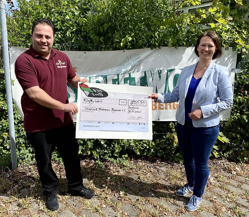 Spendenübergabe Eistreff Bergkamen Die Vorsitzende des Streetwork-Fördervereins Sabine Bellert freut ich über die Spende vom Eistreff-Betreiber Ibrahim Islak.