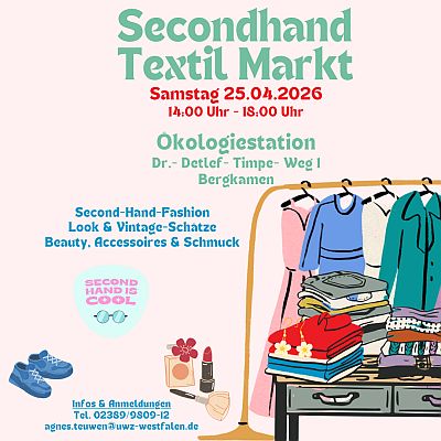 Alle, die Lust auf besondere Fundstücke abseits der üblichen Ladenketten haben, sollten sich Samstag, den 25. April 2026, vormerken. Von 14:00 bis 18:00 Uhr verwandelt sich die Ökologiestation des Kreises Unna in Bergkamen (Dr.-Detlef-Timpe-Weg 1, 59192 Bergkamen) in einen Secondhand-Textilmarkt und wird zu einem Treffpunkt für alle, die gerne stöbern, kombinieren und echte Einzelstücke entdecken.