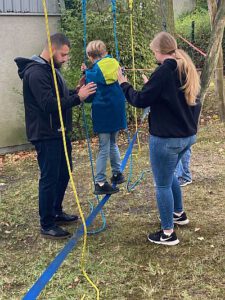 Nach den vier Theatervorstellungen wartete auf die Kinder ein besonderes Highlight: In der Anlaufstelle Streetwork mit dem angrenzenden Freiraum hatte das Team der Jugendförderung Bergkamen einen abwechslungsreichen Mutparcours aufgebaut. An verschiedenen Stationen konnten die Schüler*innen ihr neu gewonnenes Selbstvertrauen unter Beweis stellen und eigene Grenzen austesten. Der Niedrigseilparcours forderte Balance und Geschicklichkeit, während die Kinder an der Bastelstation aus Waschlappen und verschiedenen Materialien ihren ganz persönlichen Mutmacher kreierten. Das absolute Highlight war jedoch der nachgebaute, mit Schwarzlicht ausgestattete Keller von Tante Thea aus dem Theaterstück.