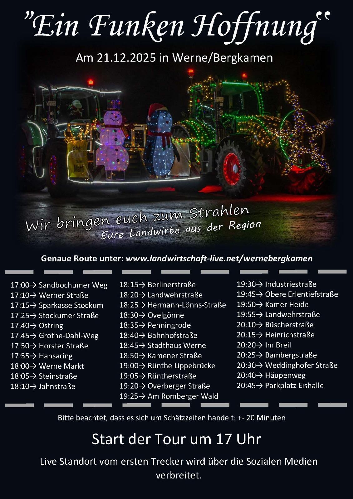 Die Lichterfahrt der Landwirte 2025 unter dem Motto „Ein Funken Hoffnung“ findet am 4. Advent, 21. Dezember, statt und führt von Werne nach Bergkamen. Start ist um 17 Uhr am Sandbochumer Weg in Werne Stockum. Laut Streckenplan soll die Lippebrücke in Rünthe gegen 19 Uhr überfahren werden. Von dort geht es durch Rünthe, Overberge, Bergkamen-Mitte bis zum Endpunkt auf dem großen Parkplatz am Häupenbad / Eishalle gegen 20.45 Uhr. Die Landwirte weisen ausdrücklich darauf hin, dass es sich hierbei um Schätzzeiten handelt. Abweichung von bis zu 20 Minuten sind möglich.