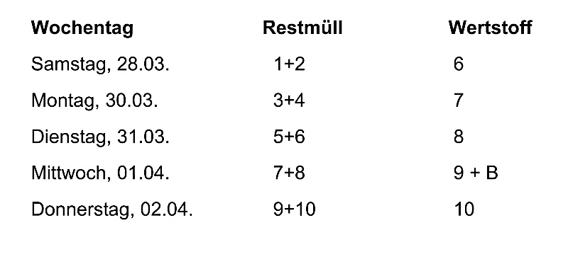 Die Abfuhr erfolgt demnach an folgenden Tagen: