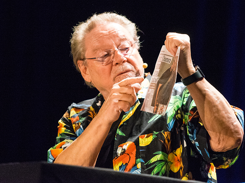 „Das kann ich nicht annehmen!“, raunte der so Gepriesene und schickte Kusshände in die ausverkauften Ränge. „Ihr seid toll!“, bedankte er sich mit der Glocke in der Hand beim Abgang und verschaffte sich bimmelnd Bahn bis zum Büchertisch. Immerhin hatten ihm die Bergkamener nicht nur mit Begeisterungs-Pfiffen und „Bravo“-Rufen gehuldigt. Mehr als zwei Stunden lang krümmten sie sich vor Lachen auf ihren Sitzen, erlitten unüberhörbare Vergnügungszusammenbrüche und versorgten den TV-, Kino-, Hörbuch- und Literatur-Profi immer wieder mit kreativen Zwischenrufen. Ein dankbares Futter für ihn, der sich gern Anregungen auf seinen ausgedruckten Manuskripten notiert, um sie für die nächsten Auftritte zu verwenden. Eine ganze Reihe davon steuerte seine Bergkamen-Premiere bei, wie die zahlreichen Kritzeleien am Zettelrand bewiesen.